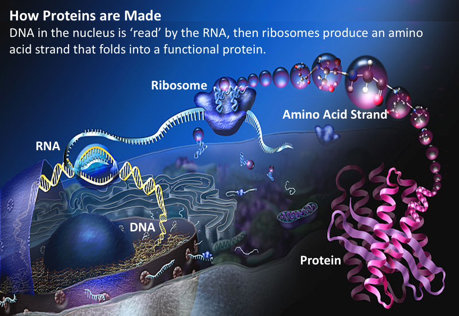 The NanoVi device helps your genome by improving protein function. Proteins do almost everything in your body; including repair of damage that occurs during the process of making proteins. Below is a quick overview of how proteins are made, starting with the DNA: